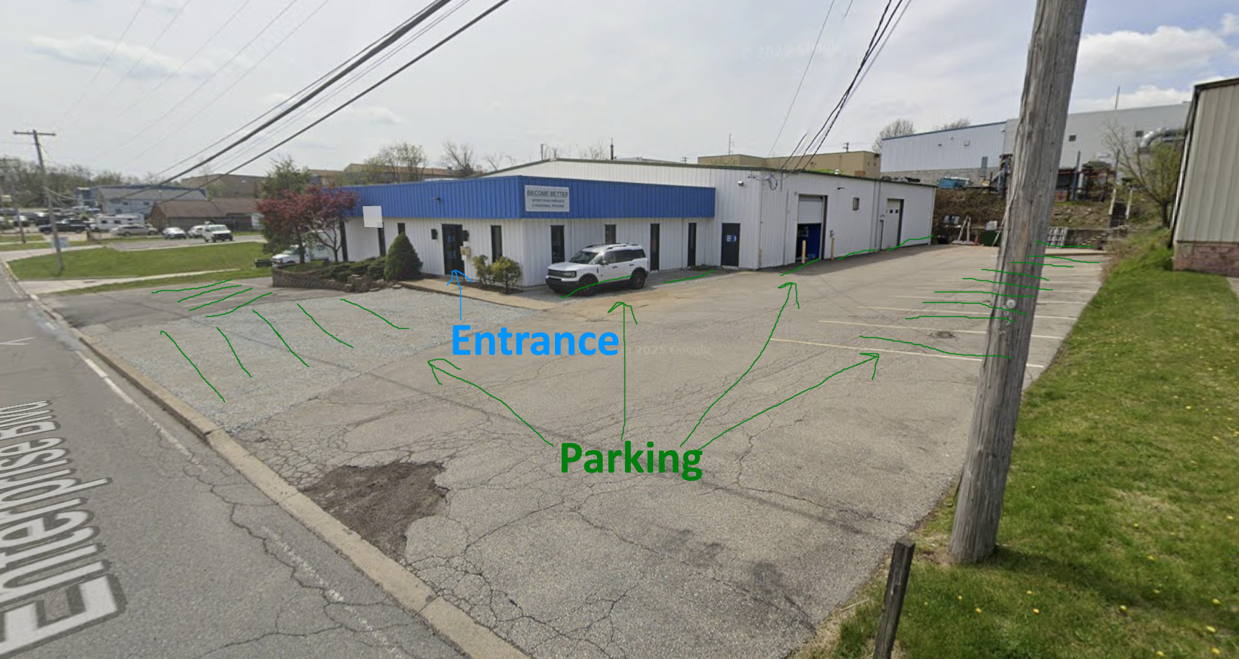 There’s room to park 25-30 cars comfortably, with room for several more if we double park. I’ve marked up these street view and satellite view images to show parking and the main entrance.